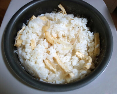 ①炊飯器に米、酒、塩、細切りにした油揚げを入れて炊く